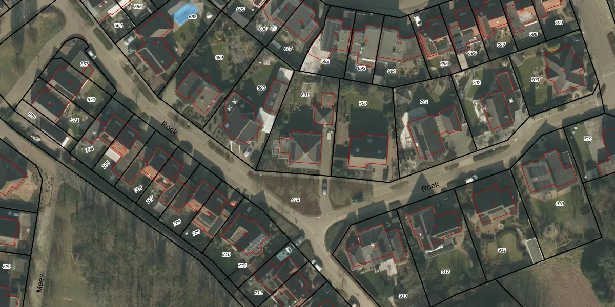 Het perceel waarop Roek 10 staat heeft een oppervlakte van 650 m². Dit is een groot perceel. De perceeloppervlakte wordt geregistreerd door het Kadaster. Gedetailleerde informatie over de maten van dit perceel kunt u vinden in het rapport Kadastrale kaart met maatvoering van Roek 10.