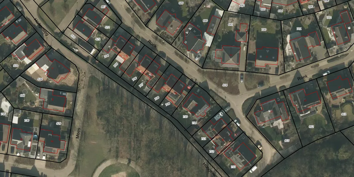 Het perceel waarop Roek 33 staat heeft een oppervlakte van 207 m². Dit is een middelgroot perceel. De perceeloppervlakte wordt geregistreerd door het Kadaster. Gedetailleerde informatie over de maten van dit perceel kunt u vinden in het rapport Kadastrale kaart met maatvoering van Roek 33.