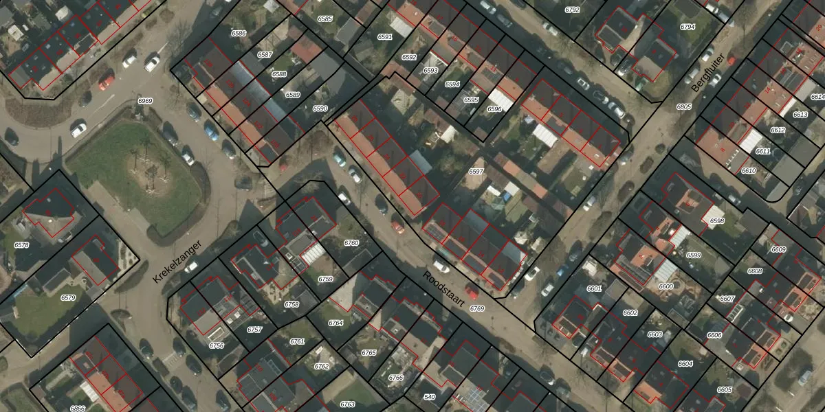 Het perceel waarop Roodstaart 20 staat heeft een oppervlakte van 2163 m². Dit is een zeer groot perceel. De perceeloppervlakte wordt geregistreerd door het Kadaster. Gedetailleerde informatie over de maten van dit perceel kunt u vinden in het rapport Kadastrale kaart met maatvoering van Roodstaart 20.