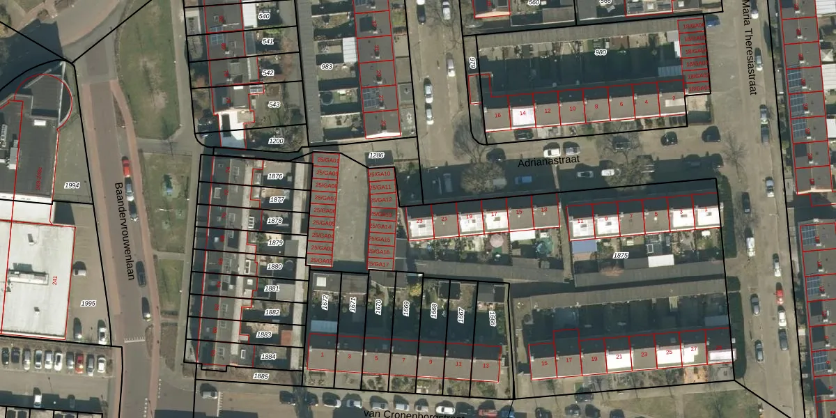 Het perceel waarop Adrianastraat 23 staat heeft een oppervlakte van 3544 m². Dit is een zeer groot perceel. De perceeloppervlakte wordt geregistreerd door het Kadaster. Gedetailleerde informatie over de maten van dit perceel kunt u vinden in het rapport Kadastrale kaart met maatvoering van Adrianastraat 23.