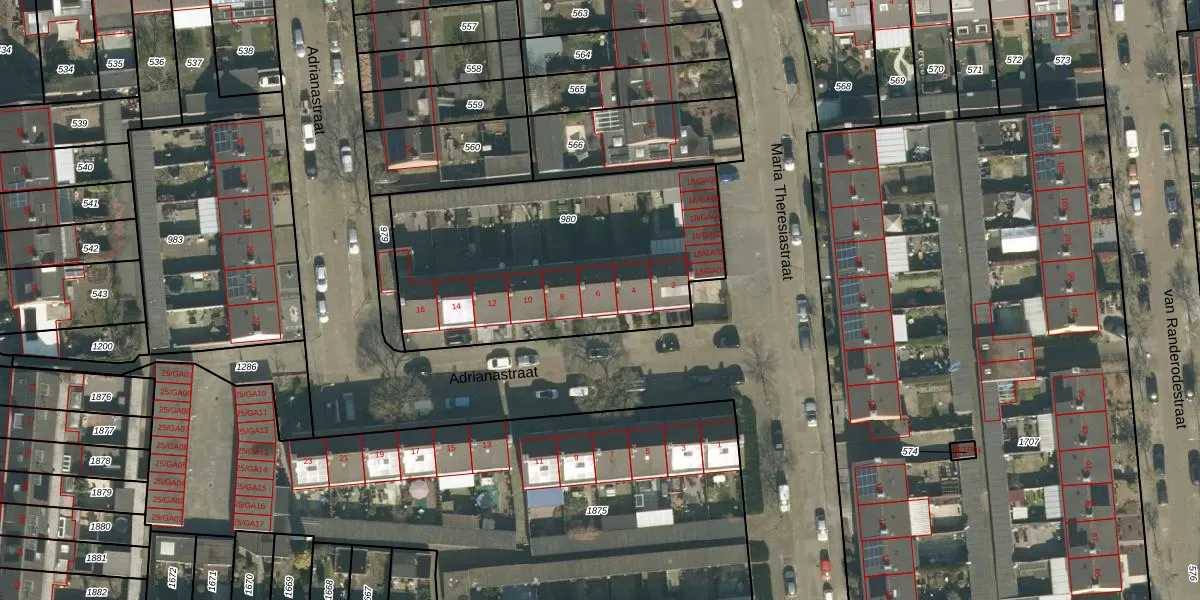 Het perceel waarop Adrianastraat 6 staat heeft een oppervlakte van 1425 m². Dit is een zeer groot perceel. De perceeloppervlakte wordt geregistreerd door het Kadaster. Gedetailleerde informatie over de maten van dit perceel kunt u vinden in het rapport Kadastrale kaart met maatvoering van Adrianastraat 6.