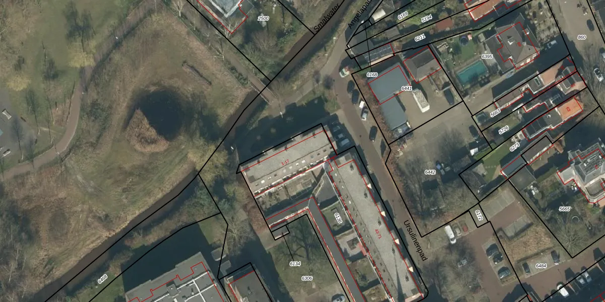 Het perceel waarop Angelapad 5 staat heeft een oppervlakte van 1884 m². Dit is een zeer groot perceel. De perceeloppervlakte wordt geregistreerd door het Kadaster. Gedetailleerde informatie over de maten van dit perceel kunt u vinden in het rapport Kadastrale kaart met maatvoering van Angelapad 5.
