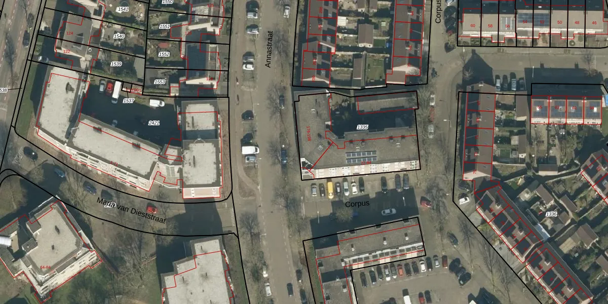 Het perceel waarop Annastraat 180 staat heeft een oppervlakte van 1047 m². Dit is een zeer groot perceel. De perceeloppervlakte wordt geregistreerd door het Kadaster. Gedetailleerde informatie over de maten van dit perceel kunt u vinden in het rapport Kadastrale kaart met maatvoering van Annastraat 180.