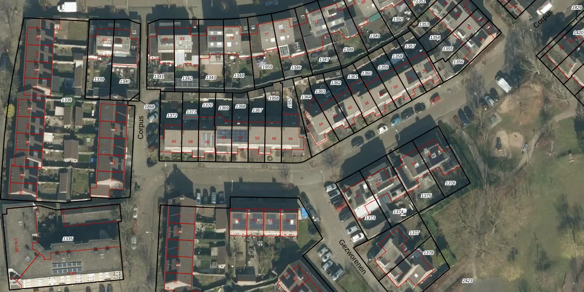 Het perceel waarop Corpus 46 staat heeft een oppervlakte van 202 m². Dit is een middelgroot perceel. De perceeloppervlakte wordt geregistreerd door het Kadaster. Gedetailleerde informatie over de maten van dit perceel kunt u vinden in het rapport Kadastrale kaart met maatvoering van Corpus 46.