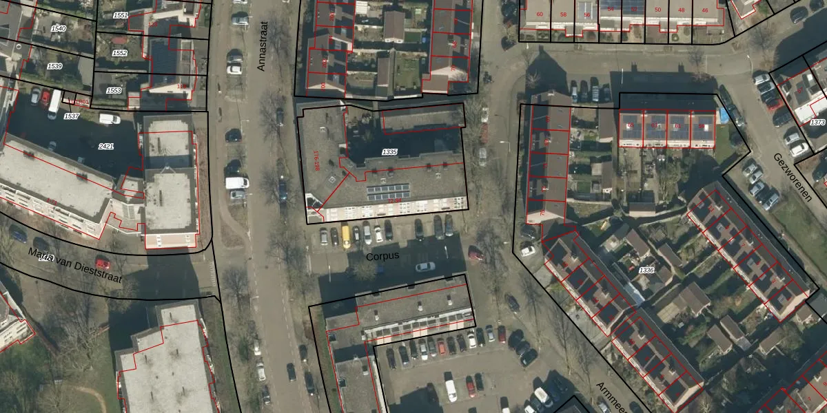 Het perceel waarop Corpus 80 staat heeft een oppervlakte van 1047 m². Dit is een zeer groot perceel. De perceeloppervlakte wordt geregistreerd door het Kadaster. Gedetailleerde informatie over de maten van dit perceel kunt u vinden in het rapport Kadastrale kaart met maatvoering van Corpus 80.