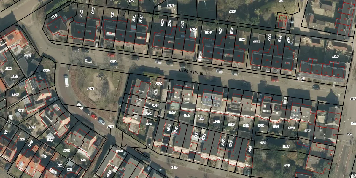 Het perceel waarop Dufourstraat 19 staat heeft een oppervlakte van 194 m². Dit is een middelgroot perceel. De perceeloppervlakte wordt geregistreerd door het Kadaster. Gedetailleerde informatie over de maten van dit perceel kunt u vinden in het rapport Kadastrale kaart met maatvoering van Dufourstraat 19.