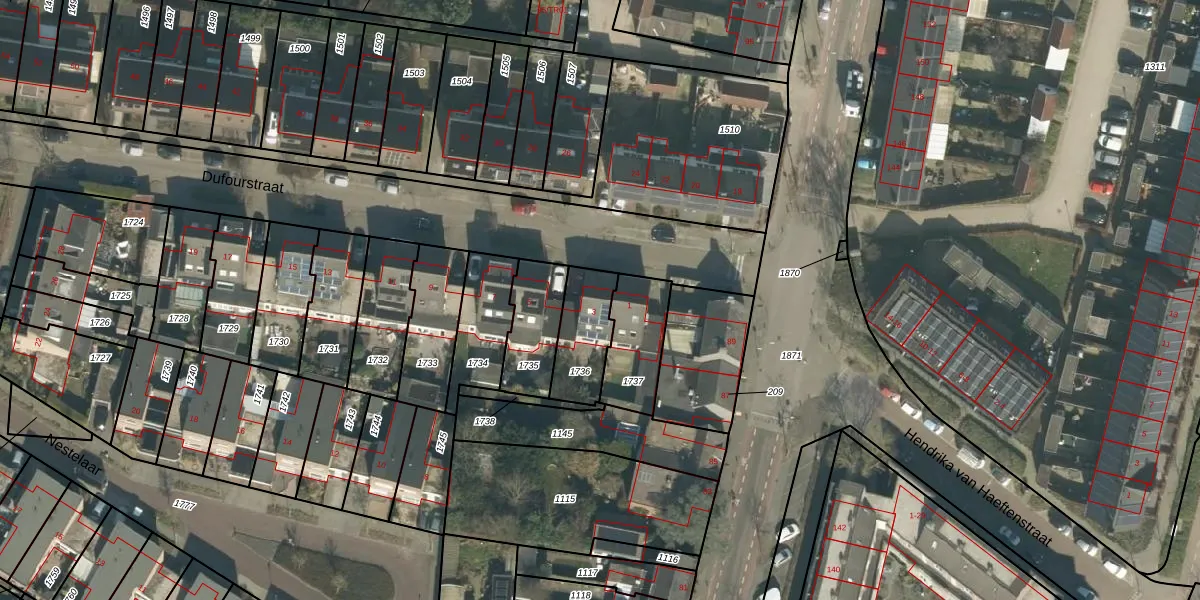 Gebruik de zoekbalk of klik op een perceel voor informatie over de adressen binnen dit perceel.
