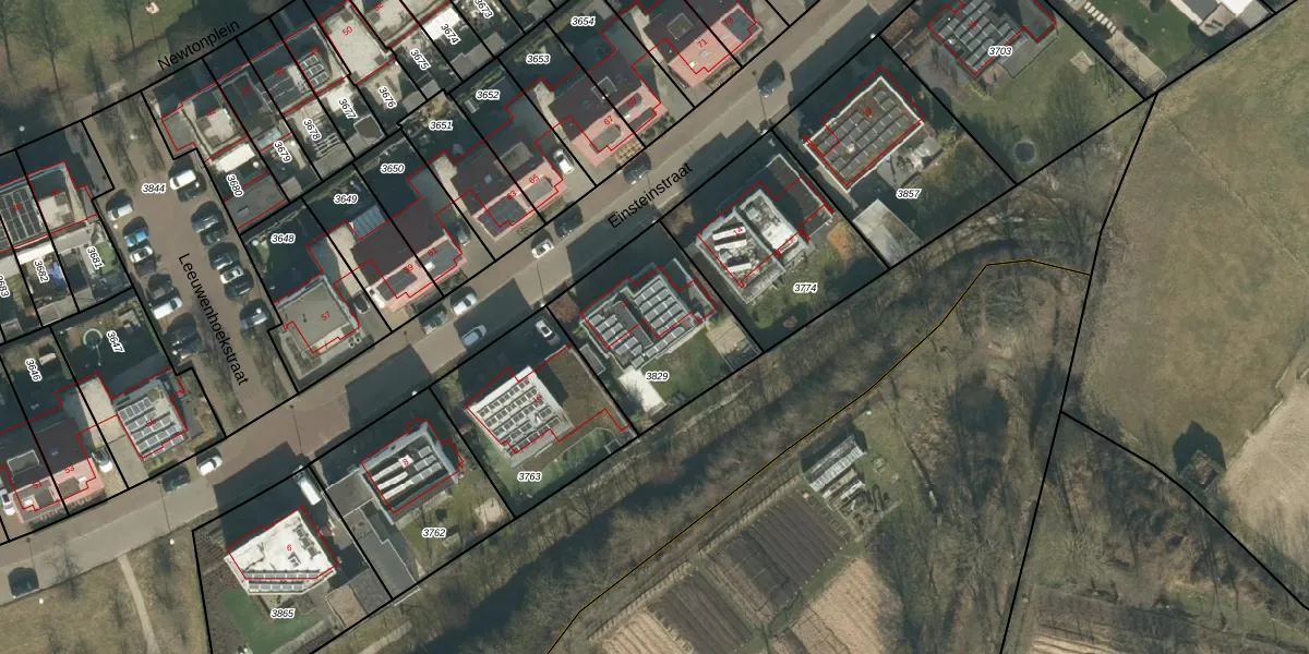 Het perceel waarop Einsteinstraat 12 staat heeft een oppervlakte van 560 m². Dit is een groot perceel. De perceeloppervlakte wordt geregistreerd door het Kadaster. Gedetailleerde informatie over de maten van dit perceel kunt u vinden in het rapport Kadastrale kaart met maatvoering van Einsteinstraat 12.