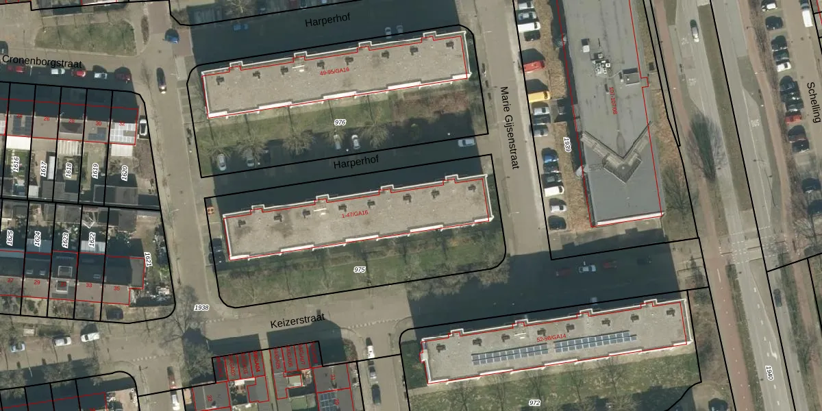 Het perceel waarop Harperhof 47-GA12 staat heeft een oppervlakte van 1940 m². Dit is een zeer groot perceel. De perceeloppervlakte wordt geregistreerd door het Kadaster. Gedetailleerde informatie over de maten van dit perceel kunt u vinden in het rapport Kadastrale kaart met maatvoering van Harperhof 47-GA12.