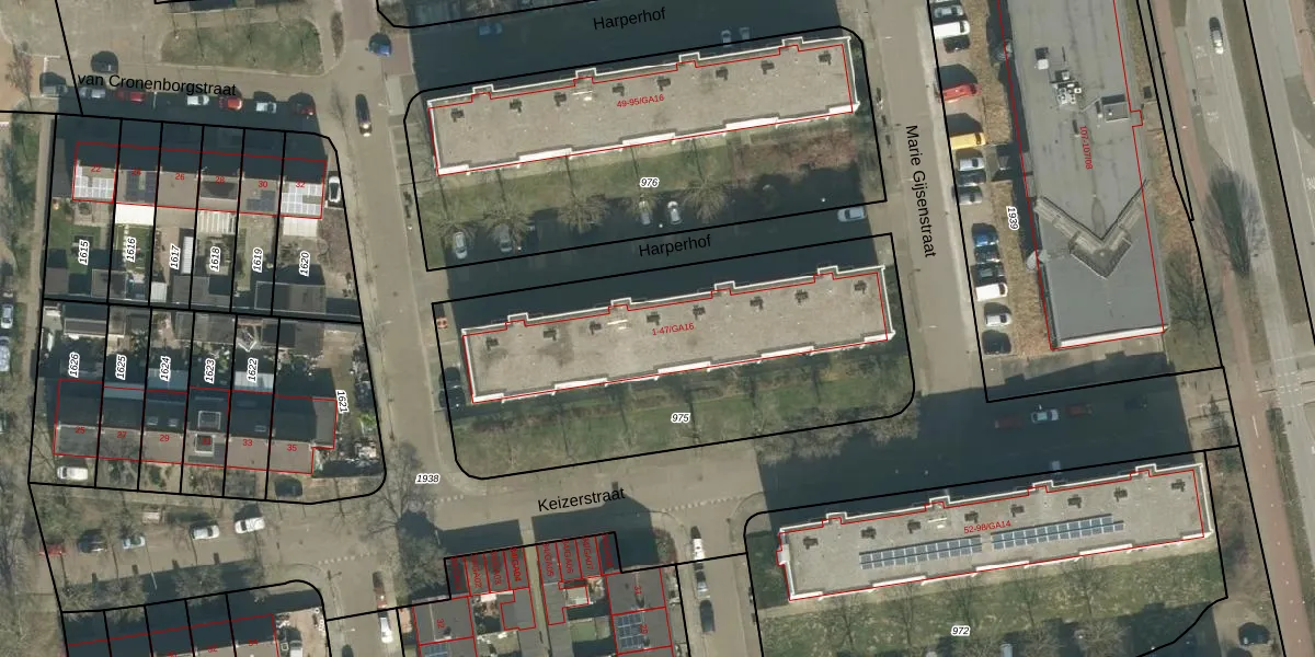 Het perceel waarop Harperhof 47-GA16 staat heeft een oppervlakte van 1940 m². Dit is een zeer groot perceel. De perceeloppervlakte wordt geregistreerd door het Kadaster. Gedetailleerde informatie over de maten van dit perceel kunt u vinden in het rapport Kadastrale kaart met maatvoering van Harperhof 47-GA16.