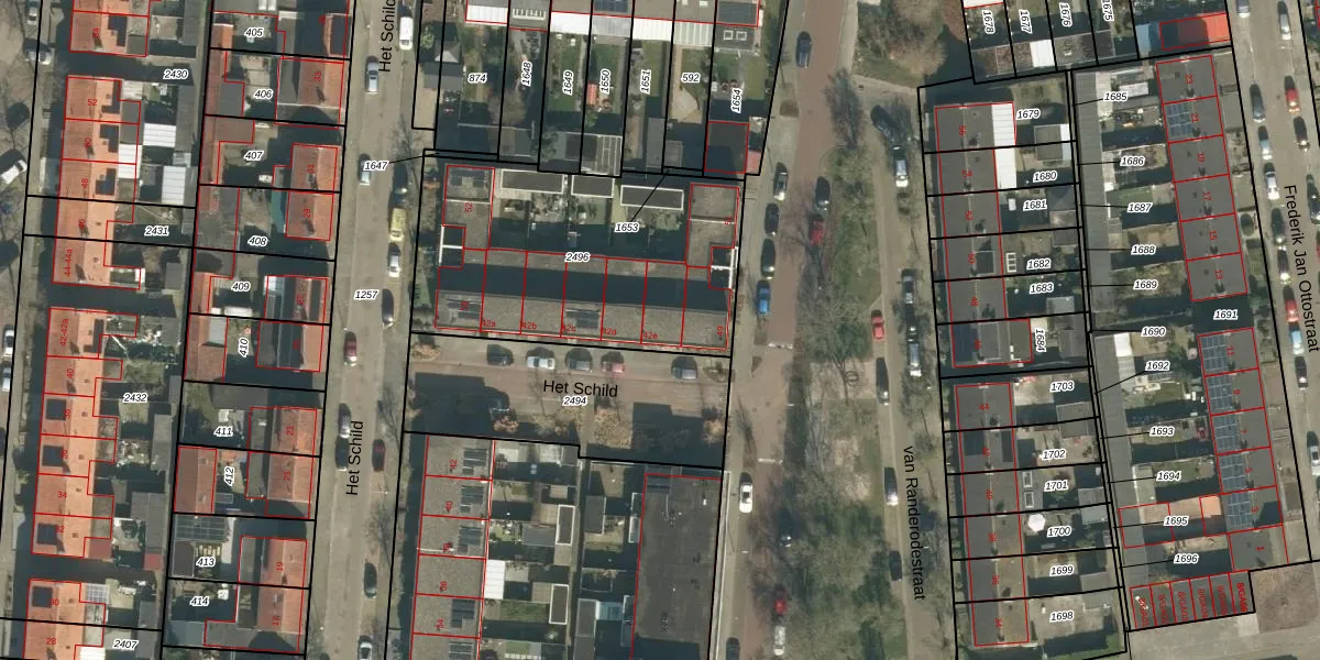 Het perceel waarop Het Schild 42-e staat heeft een oppervlakte van 1295 m². Dit is een zeer groot perceel. De perceeloppervlakte wordt geregistreerd door het Kadaster. Gedetailleerde informatie over de maten van dit perceel kunt u vinden in het rapport Kadastrale kaart met maatvoering van Het Schild 42-e.