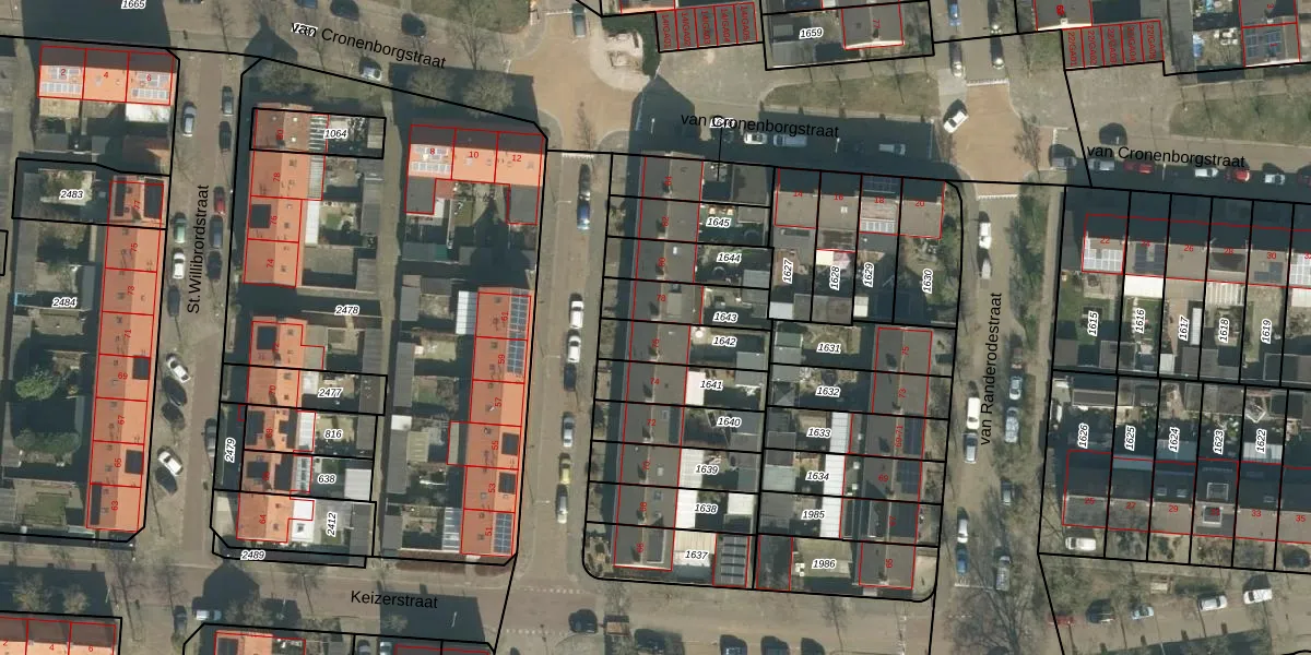 Gebruik de zoekbalk of klik op een perceel voor informatie over de adressen binnen dit perceel.
