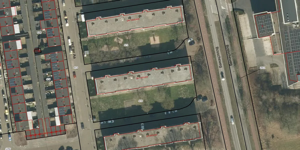 Het perceel waarop Hof ter Aa 126 staat heeft een oppervlakte van 2370 m². Dit is een zeer groot perceel. De perceeloppervlakte wordt geregistreerd door het Kadaster. Gedetailleerde informatie over de maten van dit perceel kunt u vinden in het rapport Kadastrale kaart met maatvoering van Hof ter Aa 126.