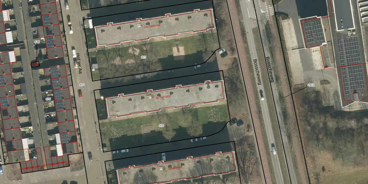 Het perceel waarop Hof ter Aa 132 staat heeft een oppervlakte van 2370 m². Dit is een zeer groot perceel. De perceeloppervlakte wordt geregistreerd door het Kadaster. Gedetailleerde informatie over de maten van dit perceel kunt u vinden in het rapport Kadastrale kaart met maatvoering van Hof ter Aa 132.
