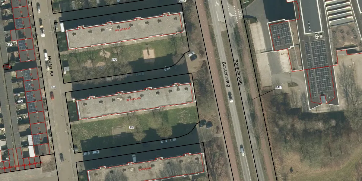 Het perceel waarop Hof ter Aa 144 staat heeft een oppervlakte van 2370 m². Dit is een zeer groot perceel. De perceeloppervlakte wordt geregistreerd door het Kadaster. Gedetailleerde informatie over de maten van dit perceel kunt u vinden in het rapport Kadastrale kaart met maatvoering van Hof ter Aa 144.