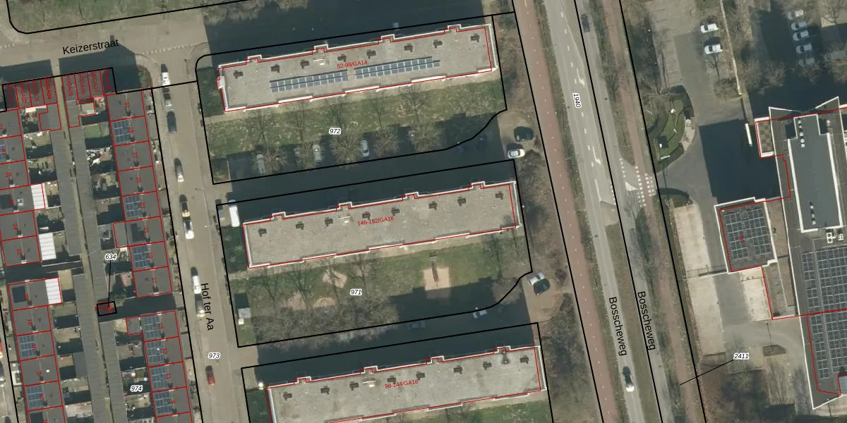 Het perceel waarop Hof ter Aa 182 staat heeft een oppervlakte van 2360 m². Dit is een zeer groot perceel. De perceeloppervlakte wordt geregistreerd door het Kadaster. Gedetailleerde informatie over de maten van dit perceel kunt u vinden in het rapport Kadastrale kaart met maatvoering van Hof ter Aa 182.