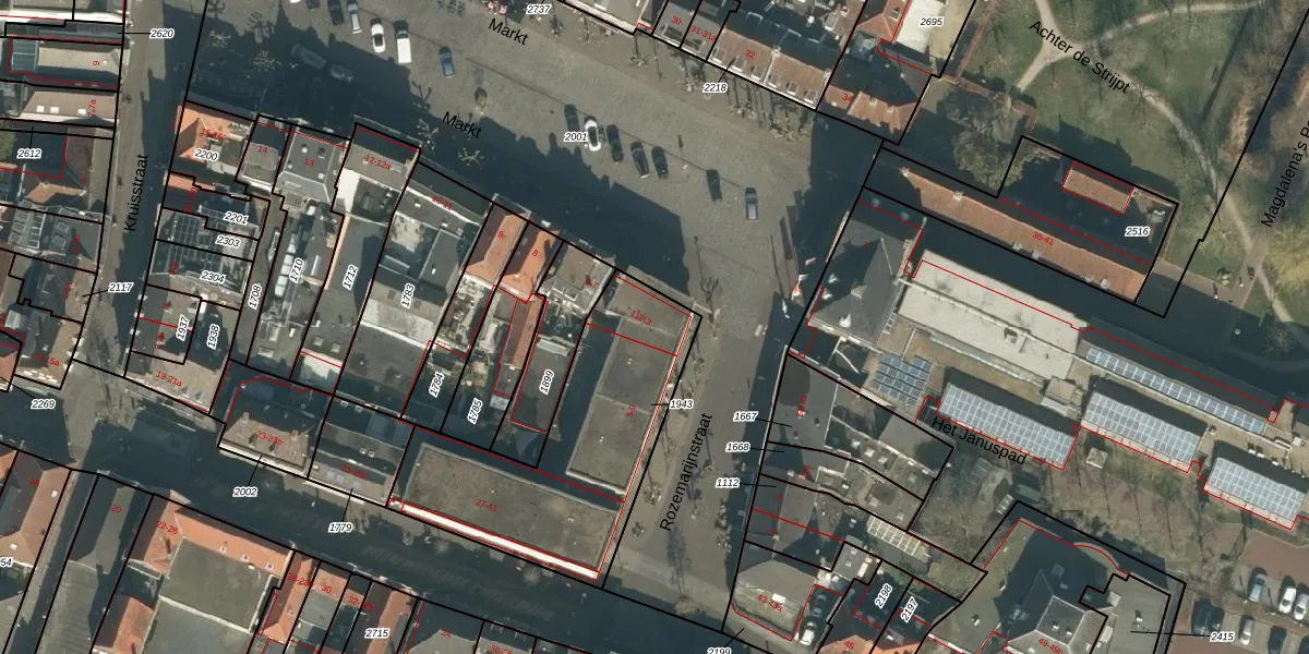 Het perceel waarop Markt 2 staat heeft een oppervlakte van 990 m². Dit is een groot perceel. De perceeloppervlakte wordt geregistreerd door het Kadaster. Gedetailleerde informatie over de maten van dit perceel kunt u vinden in het rapport Kadastrale kaart met maatvoering van Markt 2.