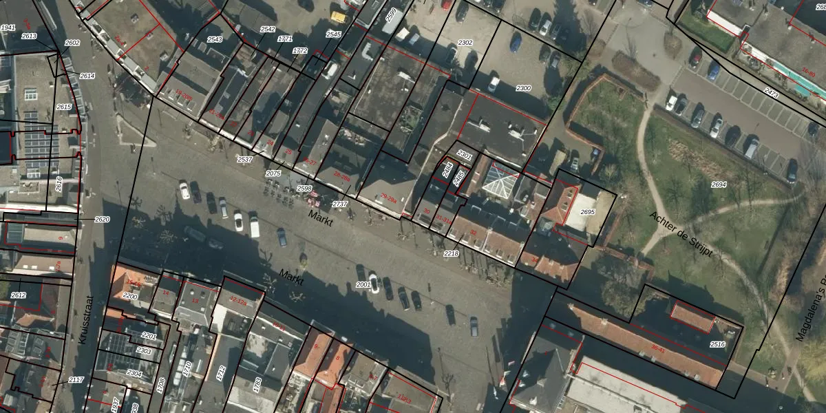Het perceel waarop Markt 29 staat heeft een oppervlakte van 996 m². Dit is een groot perceel. De perceeloppervlakte wordt geregistreerd door het Kadaster. Gedetailleerde informatie over de maten van dit perceel kunt u vinden in het rapport Kadastrale kaart met maatvoering van Markt 29.