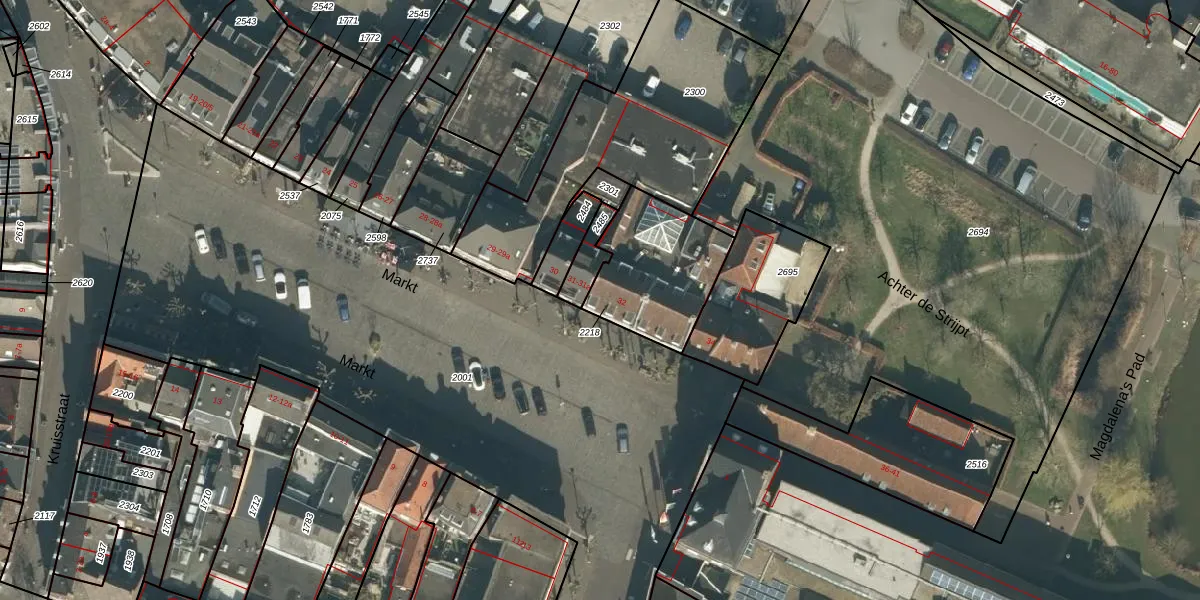 Het perceel waarop Markt 32 staat heeft een oppervlakte van 415 m². Dit is een groot perceel. De perceeloppervlakte wordt geregistreerd door het Kadaster. Gedetailleerde informatie over de maten van dit perceel kunt u vinden in het rapport Kadastrale kaart met maatvoering van Markt 32.