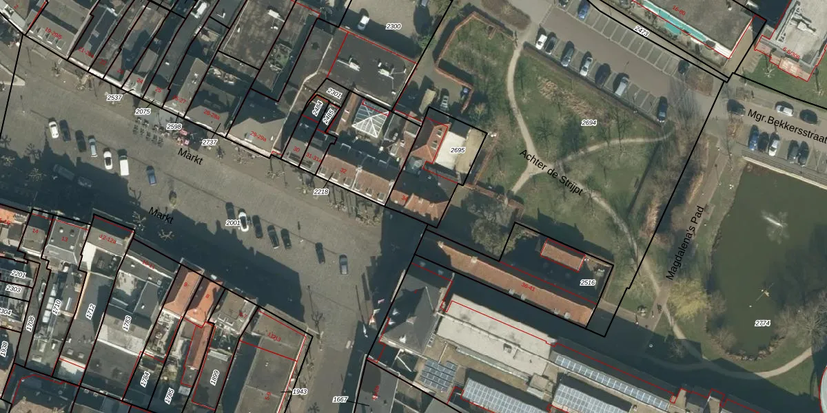 Het perceel waarop Markt 34 staat heeft een oppervlakte van 380 m². Dit is een groot perceel. De perceeloppervlakte wordt geregistreerd door het Kadaster. Gedetailleerde informatie over de maten van dit perceel kunt u vinden in het rapport Kadastrale kaart met maatvoering van Markt 34.