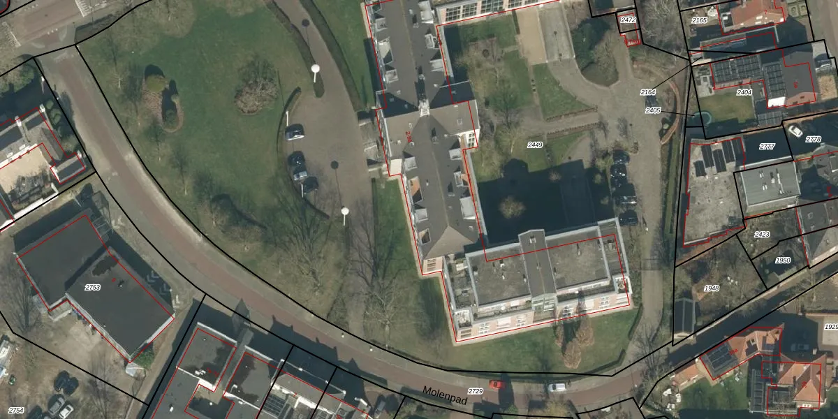 Het perceel waarop Molenpad 46 staat heeft een oppervlakte van 1,2 ha. Dit is een zeer groot perceel. De perceeloppervlakte wordt geregistreerd door het Kadaster. Gedetailleerde informatie over de maten van dit perceel kunt u vinden in het rapport Kadastrale kaart met maatvoering van Molenpad 46.
