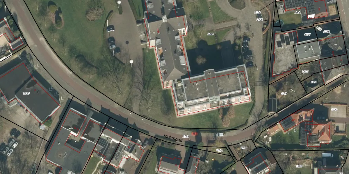 Het perceel waarop Molenpad 66 staat heeft een oppervlakte van 1,2 ha. Dit is een zeer groot perceel. De perceeloppervlakte wordt geregistreerd door het Kadaster. Gedetailleerde informatie over de maten van dit perceel kunt u vinden in het rapport Kadastrale kaart met maatvoering van Molenpad 66.