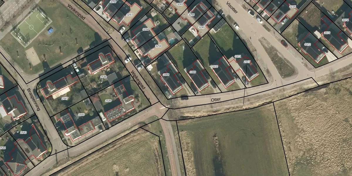 Het perceel waarop Otter 1 staat heeft een oppervlakte van 372 m². Dit is een groot perceel. De perceeloppervlakte wordt geregistreerd door het Kadaster. Gedetailleerde informatie over de maten van dit perceel kunt u vinden in het rapport Kadastrale kaart met maatvoering van Otter 1.
