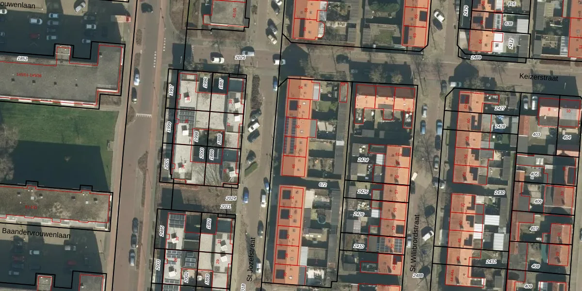 Het perceel waarop St.Jozefstraat 48 staat heeft een oppervlakte van 1820 m². Dit is een zeer groot perceel. De perceeloppervlakte wordt geregistreerd door het Kadaster. Gedetailleerde informatie over de maten van dit perceel kunt u vinden in het rapport Kadastrale kaart met maatvoering van St.Jozefstraat 48.