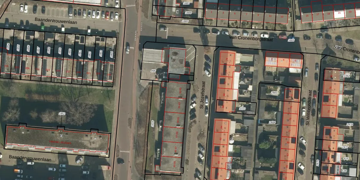 Het perceel waarop St.Jozefstraat 53 staat heeft een oppervlakte van 1084 m². Dit is een zeer groot perceel. De perceeloppervlakte wordt geregistreerd door het Kadaster. Gedetailleerde informatie over de maten van dit perceel kunt u vinden in het rapport Kadastrale kaart met maatvoering van St.Jozefstraat 53.