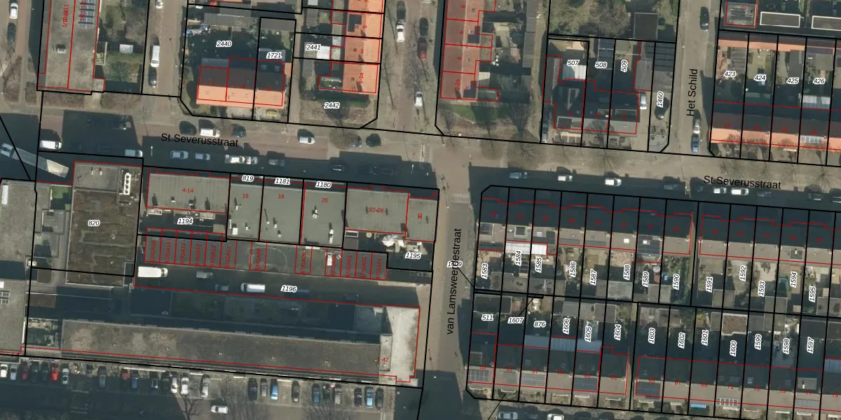 Het perceel waarop St.Severusstraat 30 staat heeft een oppervlakte van 428 m². Dit is een groot perceel. De perceeloppervlakte wordt geregistreerd door het Kadaster. Gedetailleerde informatie over de maten van dit perceel kunt u vinden in het rapport Kadastrale kaart met maatvoering van St.Severusstraat 30.