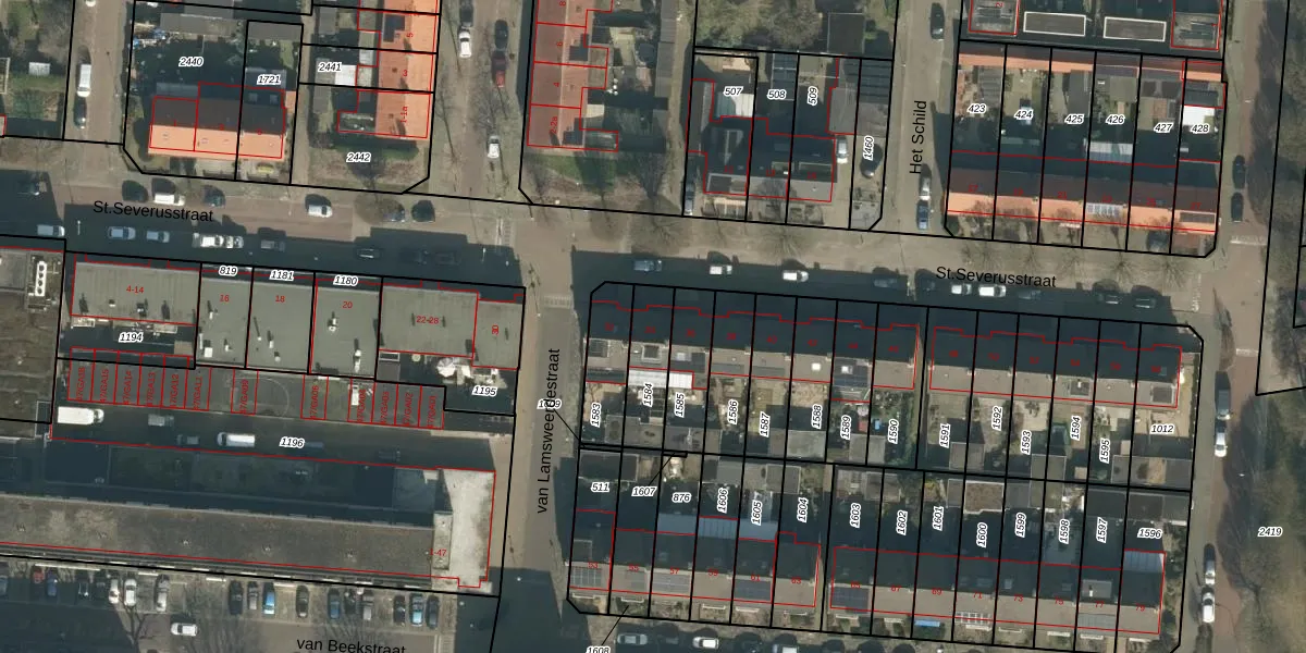 Het perceel waarop St.Severusstraat 34 staat heeft een oppervlakte van 155 m². Dit is een middelgroot perceel. De perceeloppervlakte wordt geregistreerd door het Kadaster. Gedetailleerde informatie over de maten van dit perceel kunt u vinden in het rapport Kadastrale kaart met maatvoering van St.Severusstraat 34.