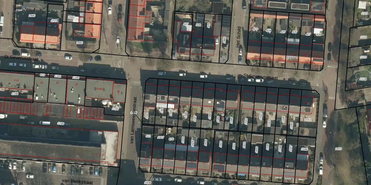 Het perceel waarop St.Severusstraat 38 staat heeft een oppervlakte van 157 m². Dit is een middelgroot perceel. De perceeloppervlakte wordt geregistreerd door het Kadaster. Gedetailleerde informatie over de maten van dit perceel kunt u vinden in het rapport Kadastrale kaart met maatvoering van St.Severusstraat 38.