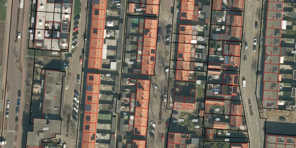 Het perceel waarop St.Willibrordstraat 25 staat heeft een oppervlakte van 2002 m². Dit is een zeer groot perceel. De perceeloppervlakte wordt geregistreerd door het Kadaster. Gedetailleerde informatie over de maten van dit perceel kunt u vinden in het rapport Kadastrale kaart met maatvoering van St.Willibrordstraat 25.