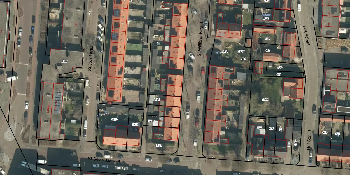Het perceel waarop St.Willibrordstraat 9 staat heeft een oppervlakte van 2002 m². Dit is een zeer groot perceel. De perceeloppervlakte wordt geregistreerd door het Kadaster. Gedetailleerde informatie over de maten van dit perceel kunt u vinden in het rapport Kadastrale kaart met maatvoering van St.Willibrordstraat 9.