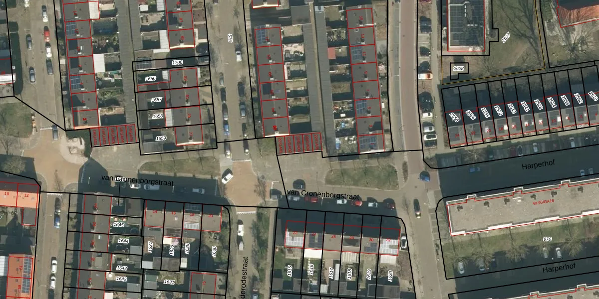 Het perceel waarop van Cronenborgstraat 22-GA03 staat heeft een oppervlakte van 6390 m². Dit is een zeer groot perceel. De perceeloppervlakte wordt geregistreerd door het Kadaster. Gedetailleerde informatie over de maten van dit perceel kunt u vinden in het rapport Kadastrale kaart met maatvoering van van Cronenborgstraat 22-GA03.