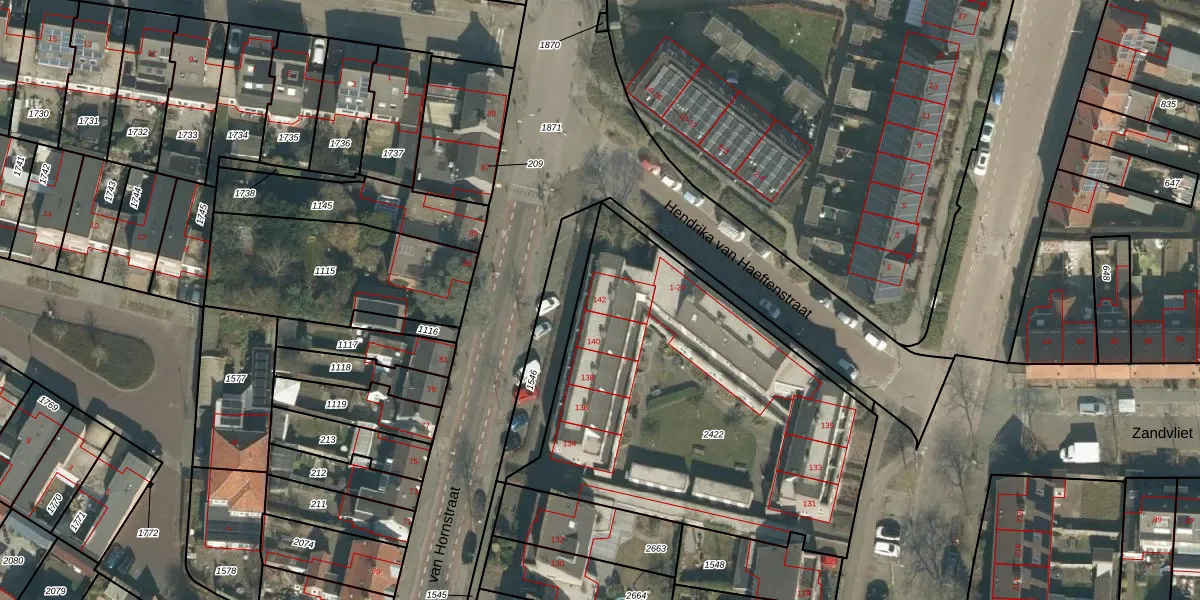 Het perceel waarop van Hornstraat 142 staat heeft een oppervlakte van 1973 m². Dit is een zeer groot perceel. De perceeloppervlakte wordt geregistreerd door het Kadaster. Gedetailleerde informatie over de maten van dit perceel kunt u vinden in het rapport Kadastrale kaart met maatvoering van van Hornstraat 142.