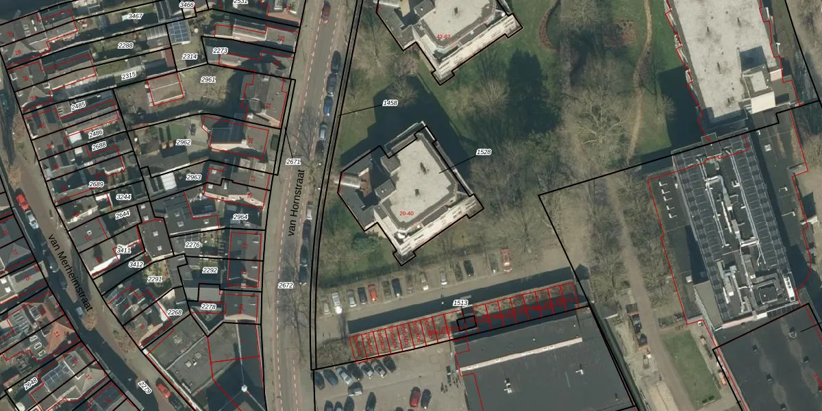 Het perceel waarop van Hornstraat 34 staat heeft een oppervlakte van 603 m². Dit is een groot perceel. De perceeloppervlakte wordt geregistreerd door het Kadaster. Gedetailleerde informatie over de maten van dit perceel kunt u vinden in het rapport Kadastrale kaart met maatvoering van van Hornstraat 34.