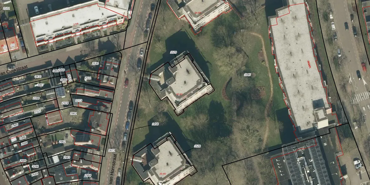 Het perceel waarop van Hornstraat 46 staat heeft een oppervlakte van 603 m². Dit is een groot perceel. De perceeloppervlakte wordt geregistreerd door het Kadaster. Gedetailleerde informatie over de maten van dit perceel kunt u vinden in het rapport Kadastrale kaart met maatvoering van van Hornstraat 46.