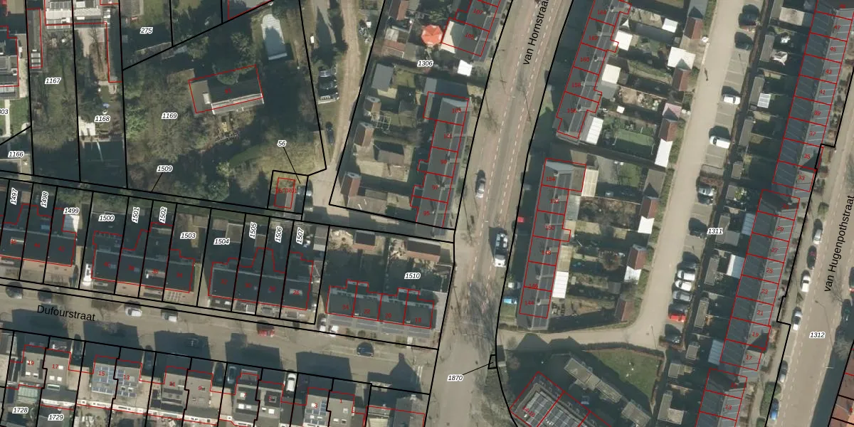 Het perceel waarop van Hornstraat 95 staat heeft een oppervlakte van 3288 m². Dit is een zeer groot perceel. De perceeloppervlakte wordt geregistreerd door het Kadaster. Gedetailleerde informatie over de maten van dit perceel kunt u vinden in het rapport Kadastrale kaart met maatvoering van van Hornstraat 95.