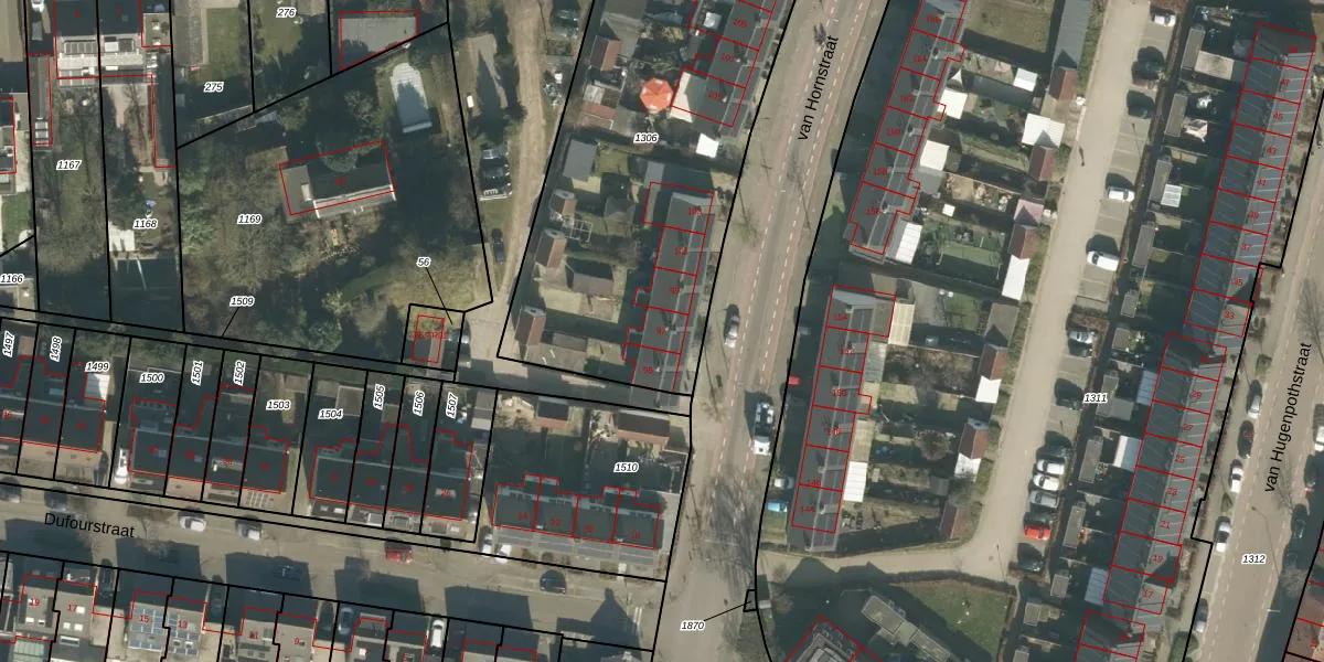 Het perceel waarop van Hornstraat 97 staat heeft een oppervlakte van 3288 m². Dit is een zeer groot perceel. De perceeloppervlakte wordt geregistreerd door het Kadaster. Gedetailleerde informatie over de maten van dit perceel kunt u vinden in het rapport Kadastrale kaart met maatvoering van van Hornstraat 97.