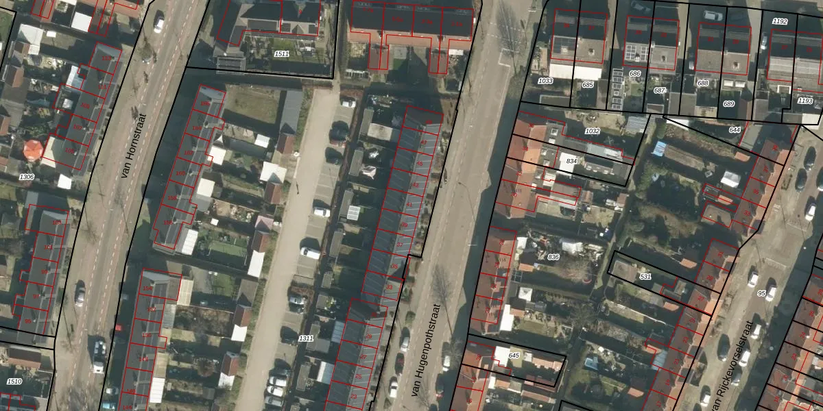 Het perceel waarop van Hugenpothstraat 41 staat heeft een oppervlakte van 9546 m². Dit is een zeer groot perceel. De perceeloppervlakte wordt geregistreerd door het Kadaster. Gedetailleerde informatie over de maten van dit perceel kunt u vinden in het rapport Kadastrale kaart met maatvoering van van Hugenpothstraat 41.