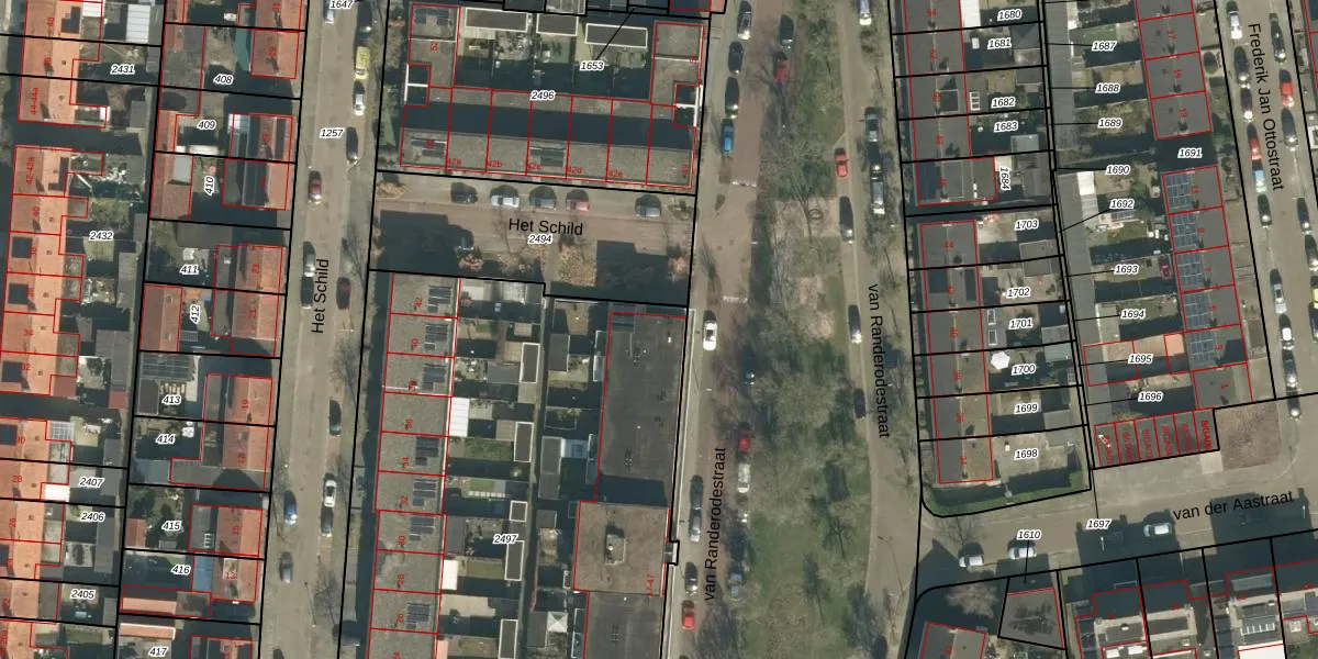 Het perceel waarop van Randerodestraat 45 staat heeft een oppervlakte van 3741 m². Dit is een zeer groot perceel. De perceeloppervlakte wordt geregistreerd door het Kadaster. Gedetailleerde informatie over de maten van dit perceel kunt u vinden in het rapport Kadastrale kaart met maatvoering van van Randerodestraat 45.