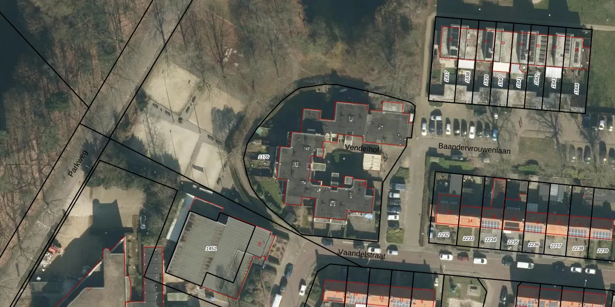 Het perceel waarop Vendelhof 14 staat heeft een oppervlakte van 2055 m². Dit is een zeer groot perceel. De perceeloppervlakte wordt geregistreerd door het Kadaster. Gedetailleerde informatie over de maten van dit perceel kunt u vinden in het rapport Kadastrale kaart met maatvoering van Vendelhof 14.