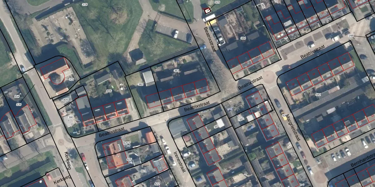Het perceel waarop Beatrixstraat 8 staat heeft een oppervlakte van 772 m². Dit is een groot perceel. De perceeloppervlakte wordt geregistreerd door het Kadaster. Gedetailleerde informatie over de maten van dit perceel kunt u vinden in het rapport Kadastrale kaart met maatvoering van Beatrixstraat 8.