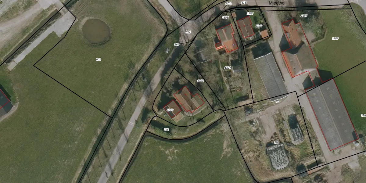 Miedwei 9 is gelegen op kadastraal perceel TND00D1246. Deze kadastrale aanduiding is uniek en wordt gebruikt door het Kadaster om eigendomsrechten en andere zakelijke rechten vast te leggen. Het perceel maakt onderdeel uit van de kadastrale gemeente Ternaard.