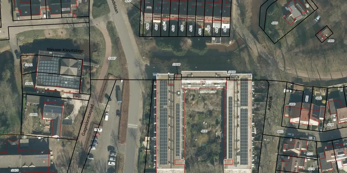 Het perceel waarop Aardrijk 87 staat heeft een oppervlakte van 3653 m². Dit is een zeer groot perceel. De perceeloppervlakte wordt geregistreerd door het Kadaster. Gedetailleerde informatie over de maten van dit perceel kunt u vinden in het rapport Kadastrale kaart met maatvoering van Aardrijk 87.
