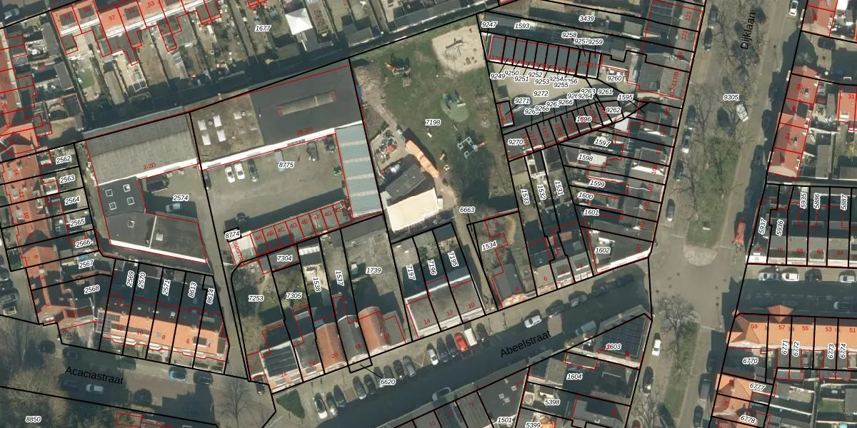 Het perceel waarop Abeelstraat 8-B staat heeft een oppervlakte van 1504 m². Dit is een zeer groot perceel. De perceeloppervlakte wordt geregistreerd door het Kadaster. Gedetailleerde informatie over de maten van dit perceel kunt u vinden in het rapport Kadastrale kaart met maatvoering van Abeelstraat 8-B.