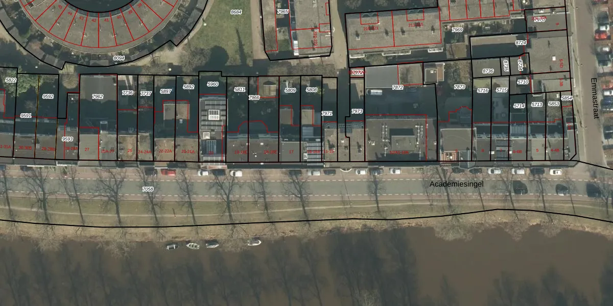Het perceel waarop Academiesingel 16-A staat heeft een oppervlakte van 197 m². Dit is een middelgroot perceel. De perceeloppervlakte wordt geregistreerd door het Kadaster. Gedetailleerde informatie over de maten van dit perceel kunt u vinden in het rapport Kadastrale kaart met maatvoering van Academiesingel 16-A.