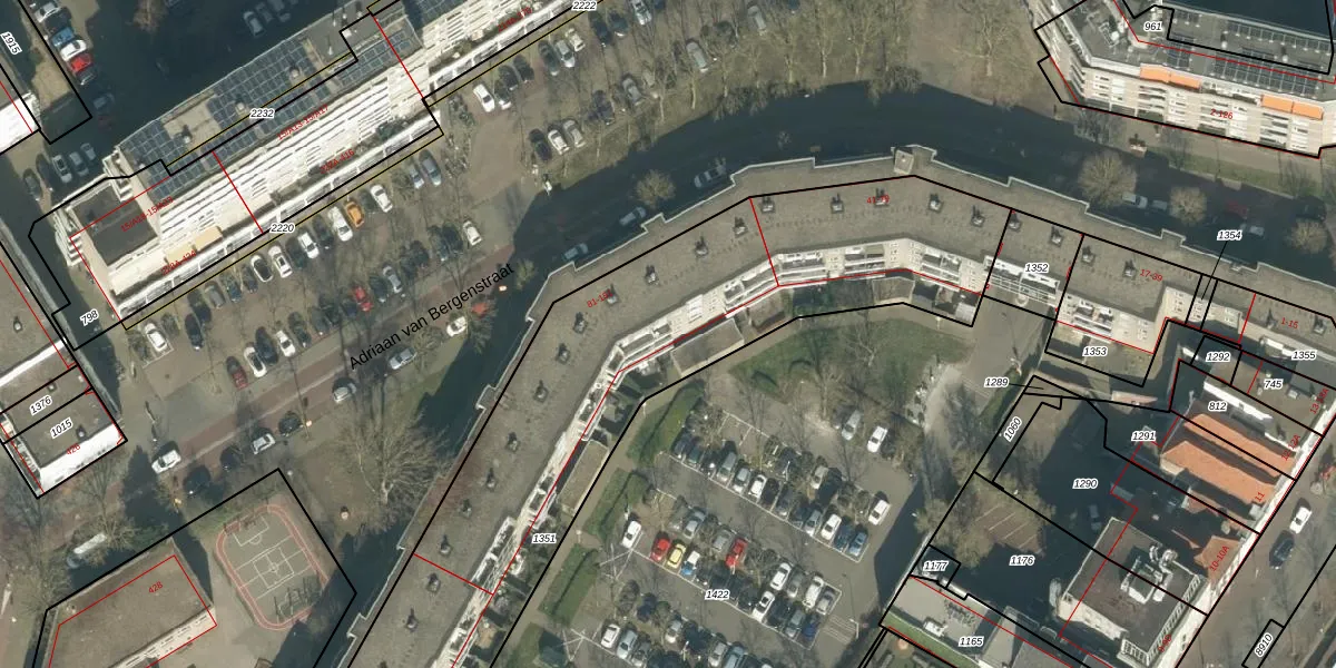 Het perceel waarop Adriaan van Bergenstraat 103 staat heeft een oppervlakte van 3297 m². Dit is een zeer groot perceel. De perceeloppervlakte wordt geregistreerd door het Kadaster. Gedetailleerde informatie over de maten van dit perceel kunt u vinden in het rapport Kadastrale kaart met maatvoering van Adriaan van Bergenstraat 103.