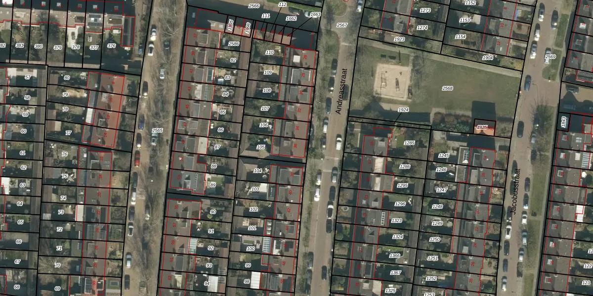 Het perceel waarop Andreasstraat 36 staat heeft een oppervlakte van 186 m². Dit is een middelgroot perceel. De perceeloppervlakte wordt geregistreerd door het Kadaster. Gedetailleerde informatie over de maten van dit perceel kunt u vinden in het rapport Kadastrale kaart met maatvoering van Andreasstraat 36.